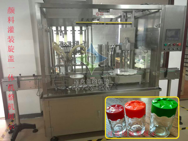 这款颜料灌装旋盖一体机可以完成自动进瓶、自动灌装、自动旋盖、自动出瓶等一系列工序;结构简单,动作稳定可靠;可单机生产,也可联入生产线中,是适合颜料、墨水、玻璃水、清洗剂、油墨、染料、化学试剂等液体灌装的理想设备。